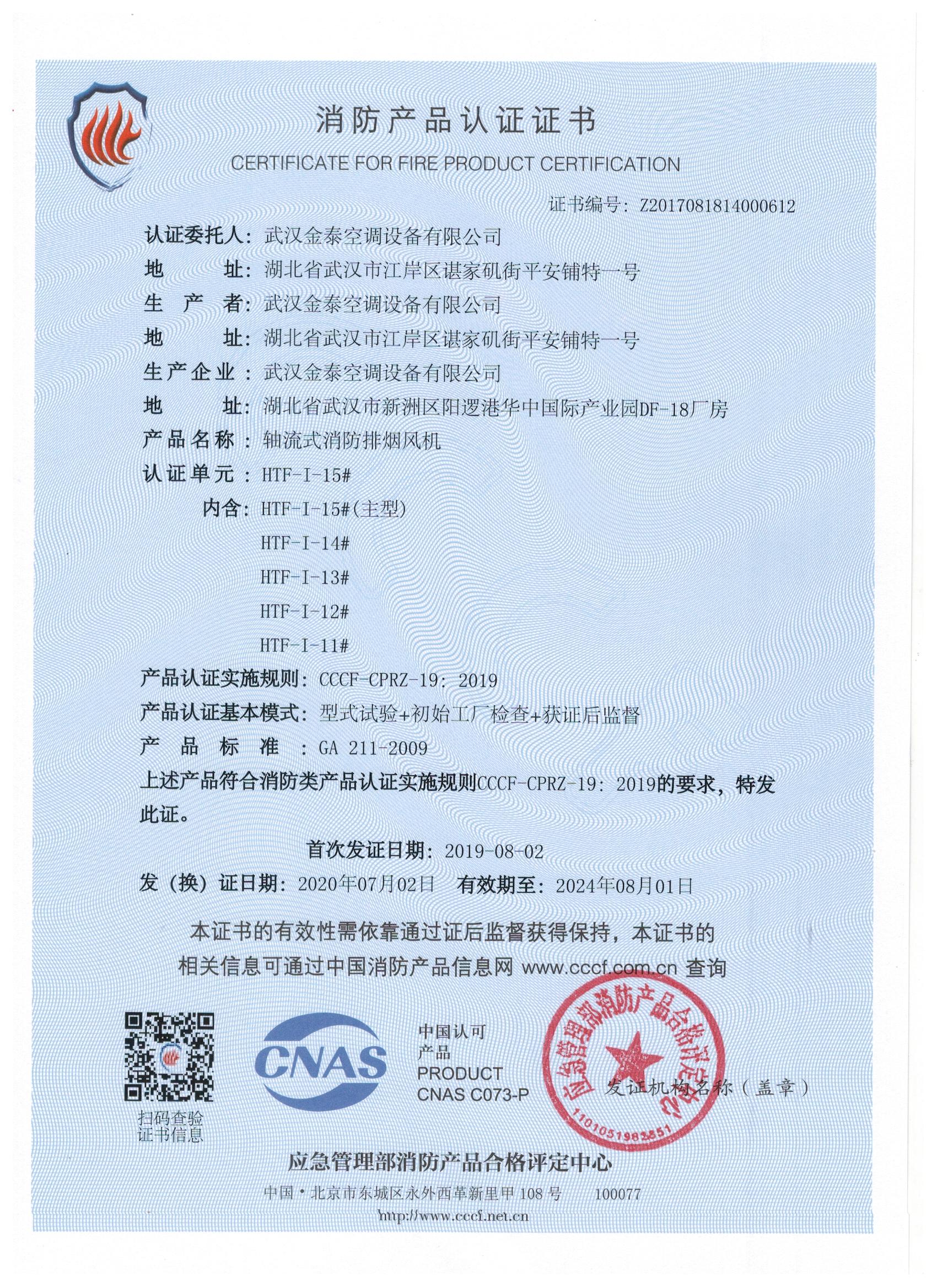 武漢金泰空調設備有限公司 是國內長期專注于民用風機、工業風機領域的標桿企業:專業生產消防排煙風機系列、排煙防火閥系列、一般通風機系列(軸流式、離心式、屋頂式、壁式、隧道式、射流式)、風口、風管等消防及通風設備。產品經公安部消防產品合格評定中心評定符合消防產品CCC標準;經中國合格評定國家認可委員會認證的檢驗所檢驗合格;經國家防火建材質量監督檢驗中心(四川中心)火燒實驗,耐火性能達標。